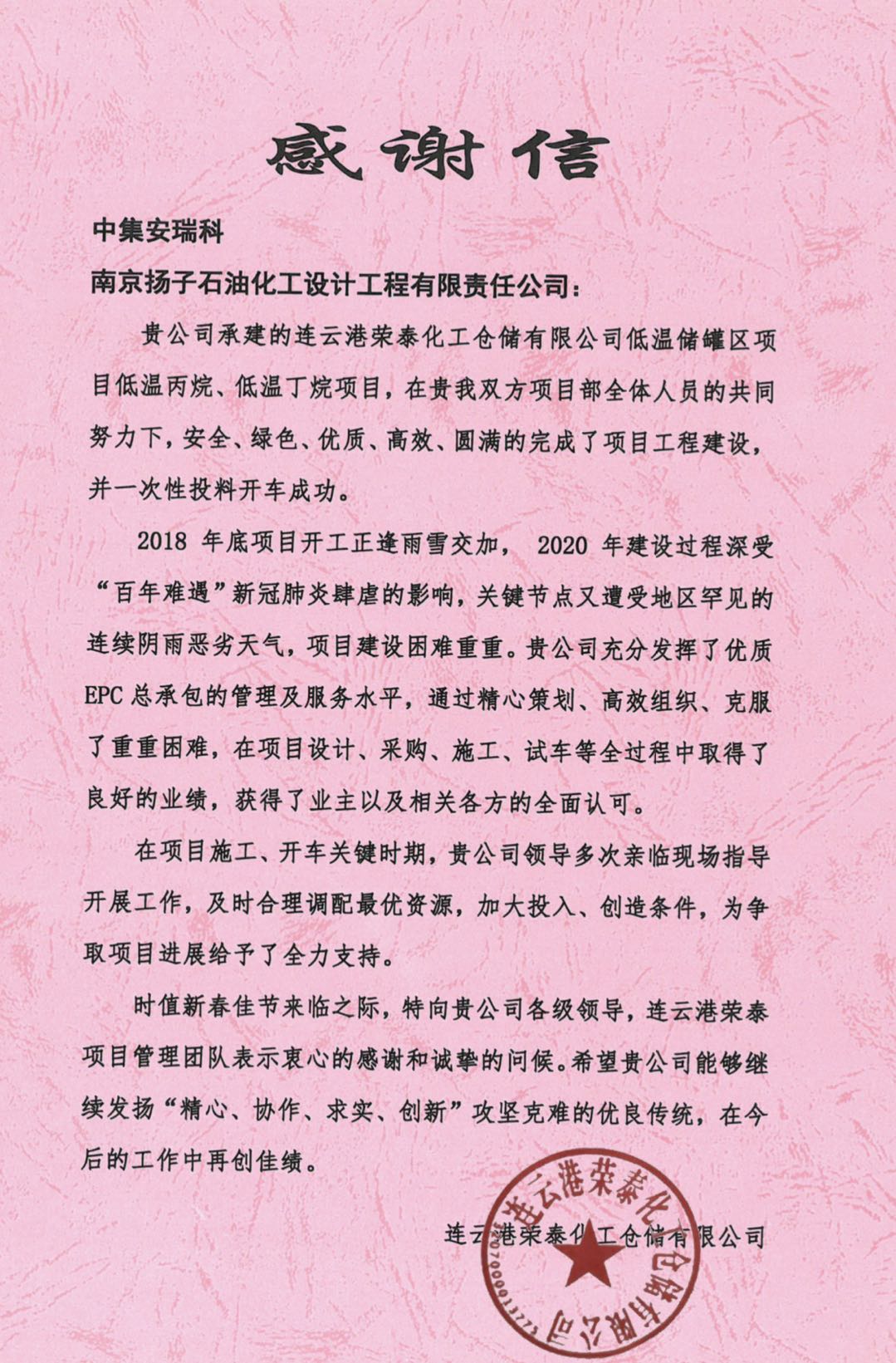 連云港榮泰化工倉儲(chǔ)有限公司低溫儲(chǔ)罐區(qū)丙烷、丁烷項(xiàng)目順利交付文/陳穎君 “連云港榮泰化工倉儲(chǔ)有限公司商儲(chǔ)罐區(qū)工程(二期)低溫罐區(qū)低溫丙烷/丁烷儲(chǔ)罐項(xiàng)目”,由南京揚(yáng)子石油化工設(shè)計(jì)工程有限責(zé)任公司EPC總...